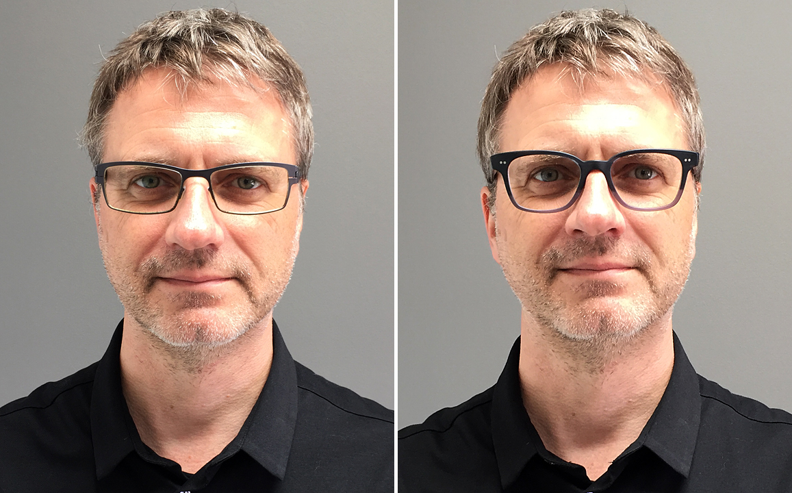 Länger schon war es Zeit für eine neue Brille und einen neuen Look (r.): viereckig statt rechteckig, Azetat statt Titan, Made in California statt Made in Berlin. Nur die neuen Gleitsichtgläser waren gewöhnungsbedürftig, und es hat gut zwei Wochen gedauert, bis die Welt um mich herum nicht mehr aussah wie durch ein Goldfischglas betrachtet.