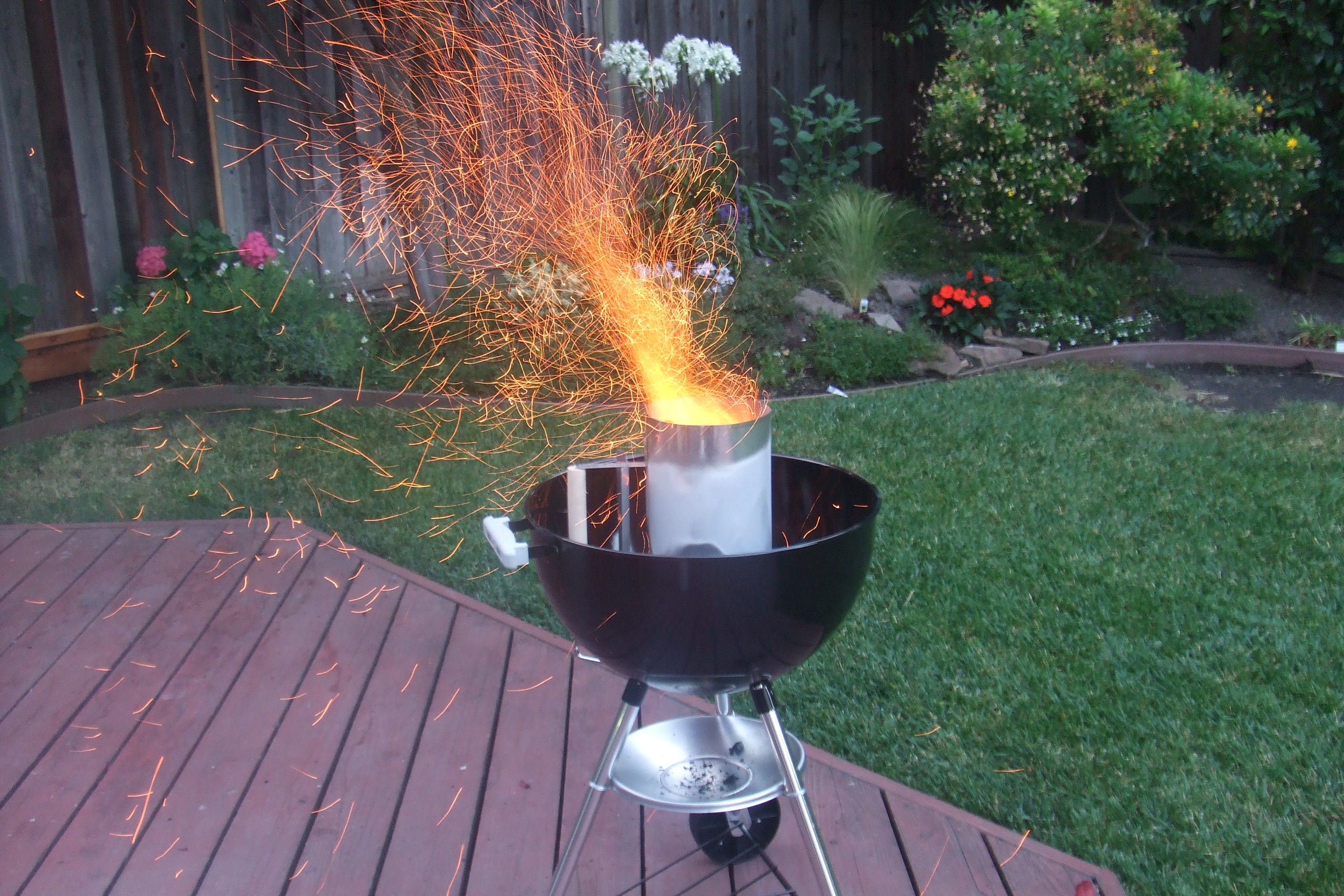Zuhause setze ich dann fast die Bude in Brand bei dem Versuch, die Mesquite-Holzkohlen besonders schnell zum Glühen zu bringen: Anzündekamin + 2 Anzünder + Zeitungspapier = Armageddon. “Burns hotter than Briquettes”, steht auf der Packung. Stimmt. Wenigstens haben wir so unser ganz privates 4th-of-July-Feuerwerk.