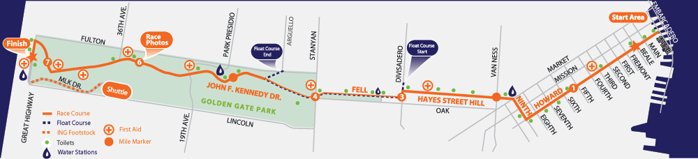 Für das Gros der Teilnehmer hingegen ist der Bay to Breakers ein großer Spaß. Viele von ihnen treten in Kostümen an, einige mit gar nichts am Leib als ein paar Laufschuhen. Letzteres ist zwar offiziell verboten, wird aber weitgehend toleriert. Genau wie der öffentliche Genuss von Bier, Marihuana oder anderen Gute-Laune-Machern. Und so laufen Sturmtruppen mit Wikinger, Elvis-Imitatoren und den Simpsons um die Wette.
