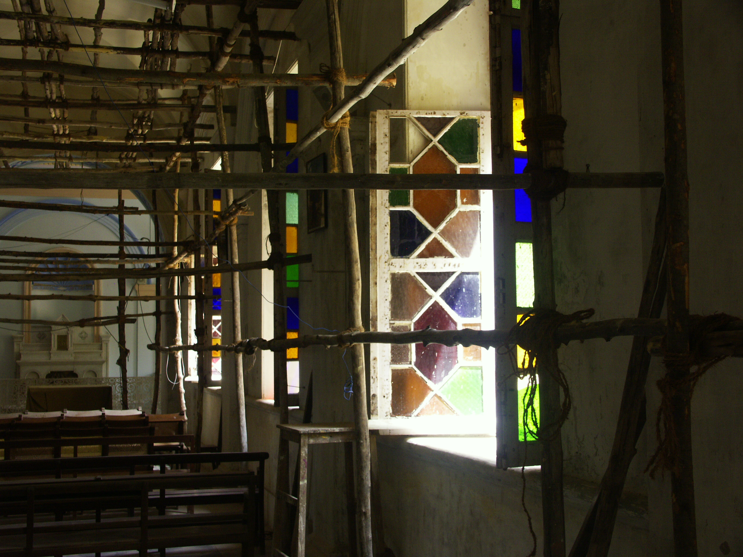 Nirgends wird dies schöner symbolisiert als durch die Église de Notre Dame, der “rosa Kirche”. Deren Äußeres strahlt in prächtig-frischem Rosa. Das Innere hingegen ist eine einzige Baustelle: Einige der bunten Glasfenster sind eingeschlagen, das halbe Kirchenschiff wird von einem wackeligen Gerüst gestützt, das auch davor schützt, dass einem die Decke auf den Kopf fällt. Neben zwei ins Gebet versunkenen Besuchern sind es vor allem Krähen, die die rosa Kirche ihr zu Hause nennen, und die mit ihrem Krächzen den passenden Soundtrack zum siechenden Gotteshaus liefern. Die Vögel lassen grüßen.