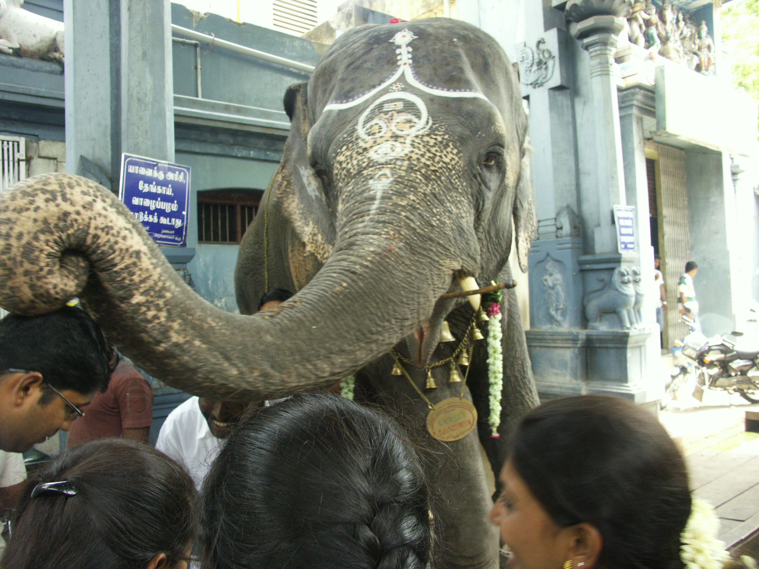 Mein Höhepunkt des Tages ist der Besuch des Tempels Manukula Vinayagar, der dem Elefantengott Ganesha gewidmet ist. So verwundert es nicht, dass vor dem Eingang ein waschechter Elefant die Gläubigen segnet. Gegen ein paar Früchte oder einen kleinen Geldbetrag bekommt man einen Stups mit dem Rüssel auf den Kopf. Väter lassen so ihre schlafenden Kinder segnen. Natürlich nehme auch ich diese Chance wahr. Flink werden mein zehn Rupien mit dem Rüssel entgegen- genommen und an den Geschäftspartner weitergereicht. Dann erhalte ich den Segen des Elefanten und frische so mein Karmakonto auf. Es ist ein ganz besonderes Gefühl, diesen herrlichen Geschöpfen so nah sein zu dürfen, und es wundert mich nicht, dass Elefanten in Indien als etwas Heiliges verehrt werden.