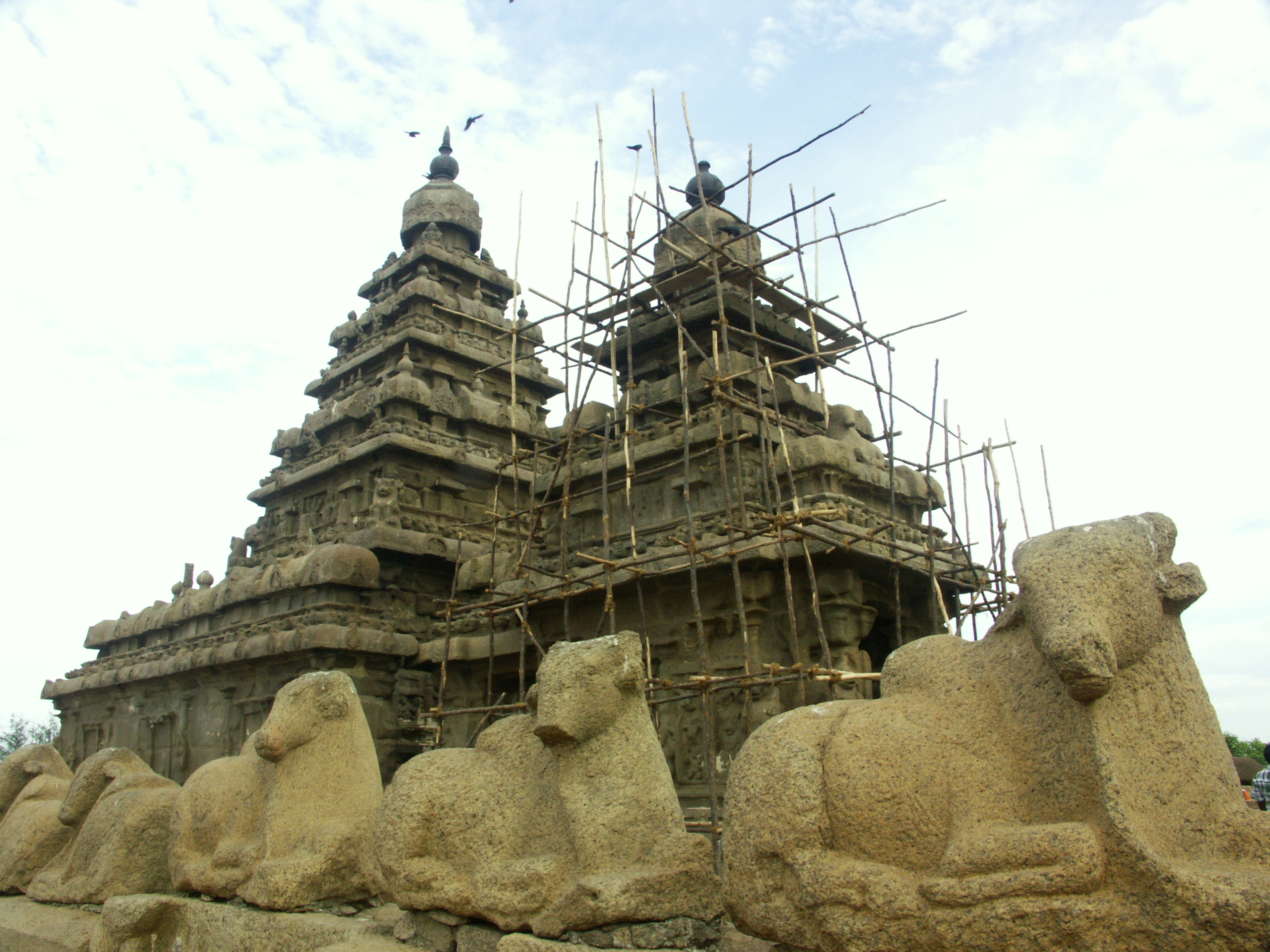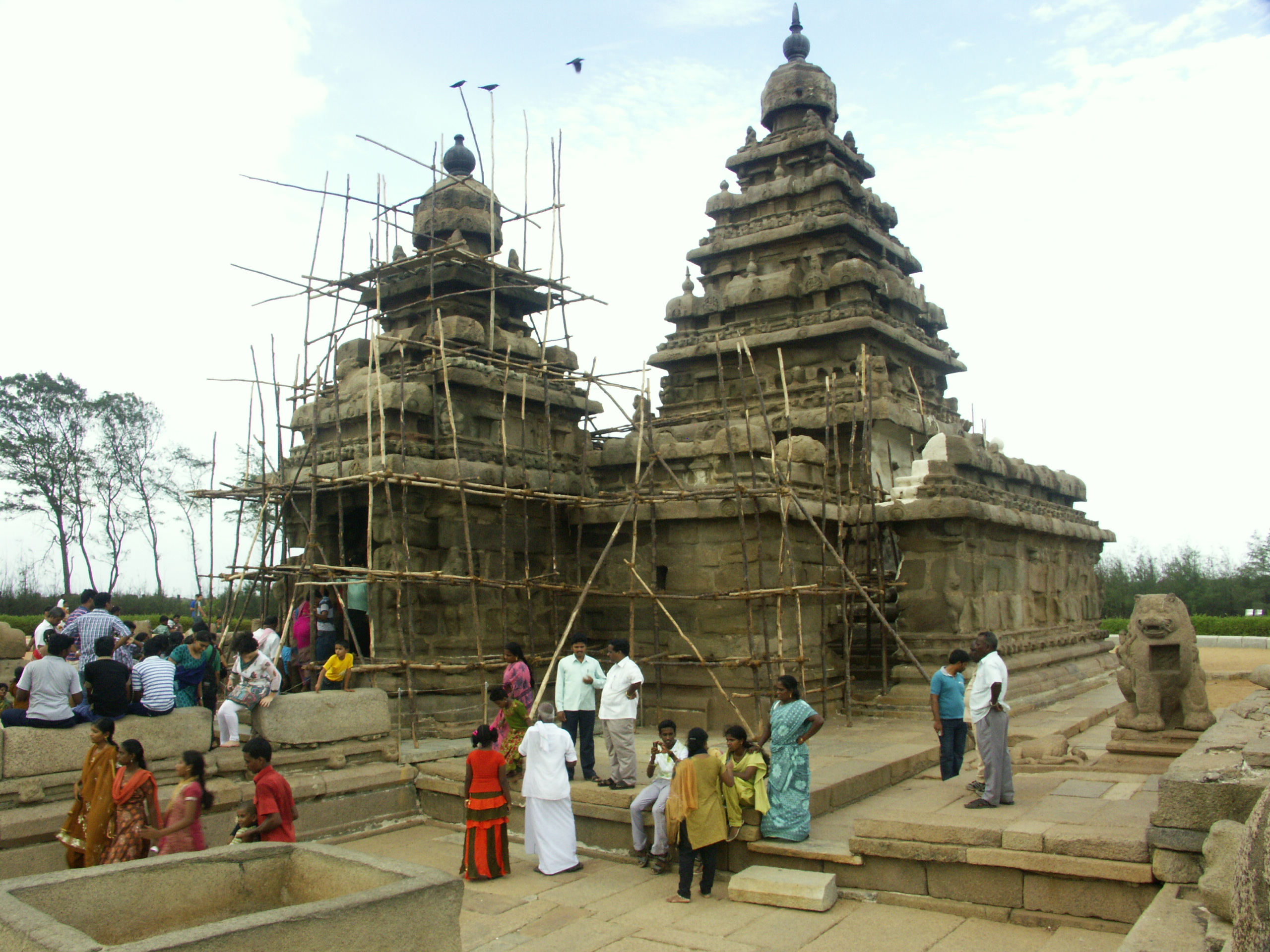 Ein weiterer Höhepunkt ist zweifelsohne der dem Gott Vishnu geweihte Küstentempel, der nicht nur knapp eineinhalb Jahrtausende überstanden hat, sondern auch die Tsunamikatastrophe von 2004. Man kann nur ahnen, wie verziert der nunmehr erodierte Tempel zum Zeitpunkt seiner Enstehung gewesen sein muss. Noch immer betreten Vishnuiten, die Anhänger Vishnus, den baufälligen Tempel, um zu beten.