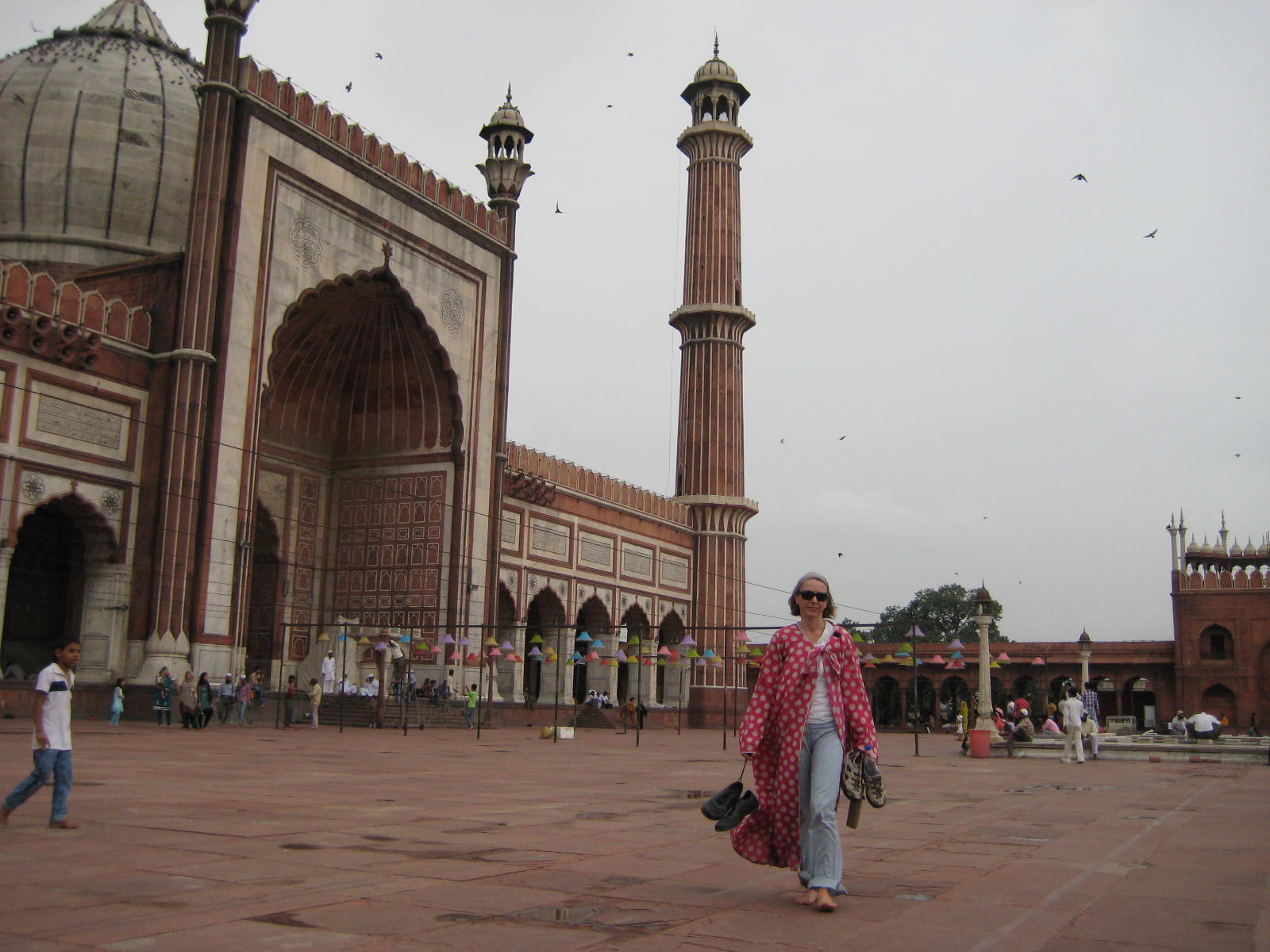 Auch in der eindrucksvollen, aus rotem Sandstein und weißen Marmor errichteten Jama Masjid, der größten Moschee Indiens, muss Chris als Fotomodell herhalten, gefragt und ungefragt. Da hilft selbst das Tarncape nicht, das sie zur Bedeckung ihrer Schultern am Eingang erhalten hat.