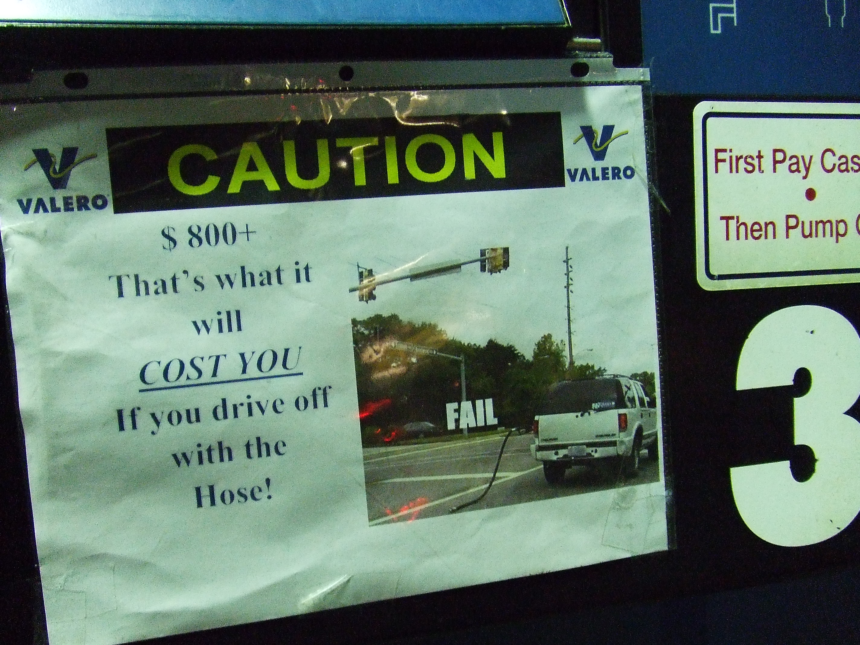 …entdecke ich an einer Tankstelle dieses Schild. Und zwar auf sämtlichen Zapfsäulen. Ich kann mir ein Lachen nicht verkneifen: Ist da tatsächlich jemand losgefahren, ohne den Füllrüssel wieder eingehängt zu haben? Scheint so. Ist jedenfalls eine wahnsinnig komische Vorstellung.