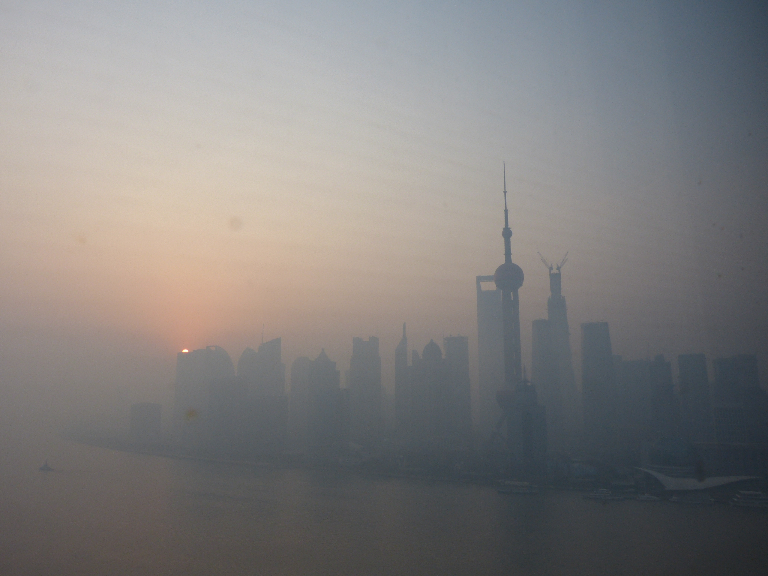 Ich wünschte es ist der Frühnebel, der sich vom Huangpu erhebt und die östliche Flussseite mit ihren Wolkenkratzern in der zarten Morgensonne wie eine romantische Märchenlandschaft erscheinen lässt. Doch ich weiß es besser: Das hier ist kein Frühnebel, das hier ist Smog. Und was da so diesig die Sonnenstrahlen filtert, sind keine feinen Nebeltropfen, sondern Feinstaubpartikel. Seit Tagen liegt ein dichter Smogschleier über der Stadt. Man kann etwa 500 Meter weit sehen, dann verschwinden die Bürotürme im schmutzigem Gelbgrau.