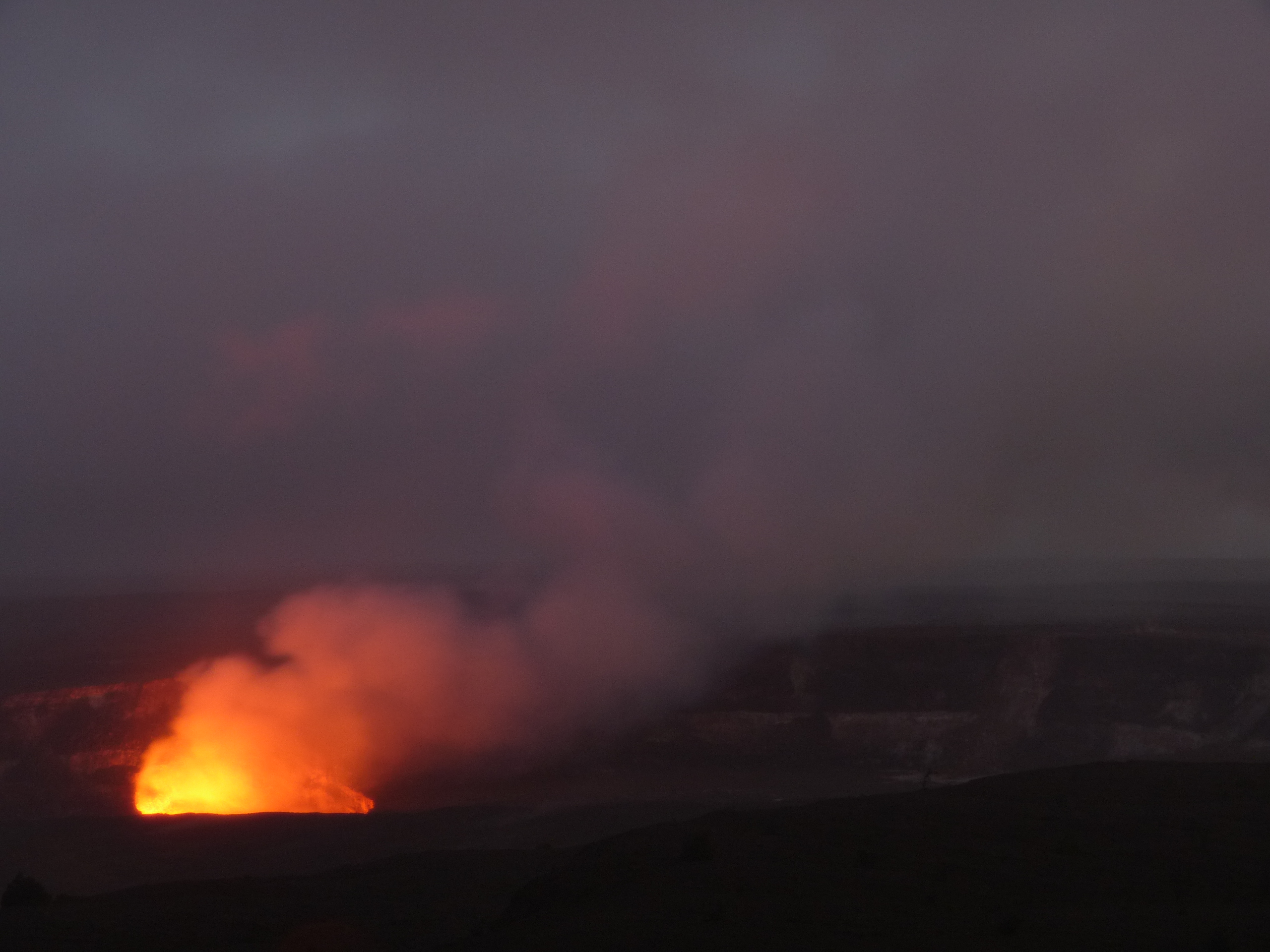 Wenn man Glück hat, sieht man die gleißende Lava langsam Richtung Meer strömen. Es existiert sogar eigens eine Telefon-Hotline für uns Vulkantouristen mit aktuellen Informationen zu vulkanischen Aktivitäten. Wir rufen die Nummer an, müssen jedoch erfahren, dass es seit Wochen zu keinen frischen Lavaflüssen gekommen ist. Schade. Immerhin sehen wir bei Dunkelheit den feuerroten Widerschein der Magma im Krater des Kīlauea. Ein einzigartiges Naturschauspiel, dem wir uns kaum entziehen können. Dass es in Strömen regnet, bekommen wir erst mit, als uns der Regen in die Unterwäsche rinnt. Zeit zu gehen.