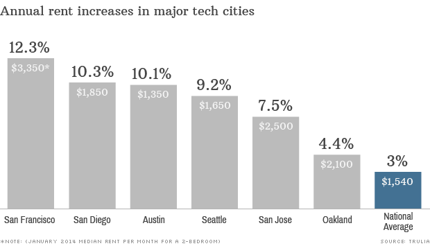 Ehemalige Arbeiterviertel wie der Mission District werden zu angesagten Szenebezirken aufpoliert. Aus Lagerhallen werden Luxusapartments. Wohntürme aus Glas wachsen in den Himmel. Und die Mieten steigen ins Maßlose: 3350 Dollar sind es im Schnitt, doch auch 9000 Dollar pro Monat für ein Zweizimmerapartment in guter Lage ist keine Seltenheit. Viele Anwohner können da nicht mithalten und ziehen weg. Kleine Läden, Galerien oder Clubs müssen schließen, weil die Miete den Gewinn auffrisst oder weil das Gebäude Platz machen muss für neu gebaute und teuer verkaufte Eigentumswohnungen.