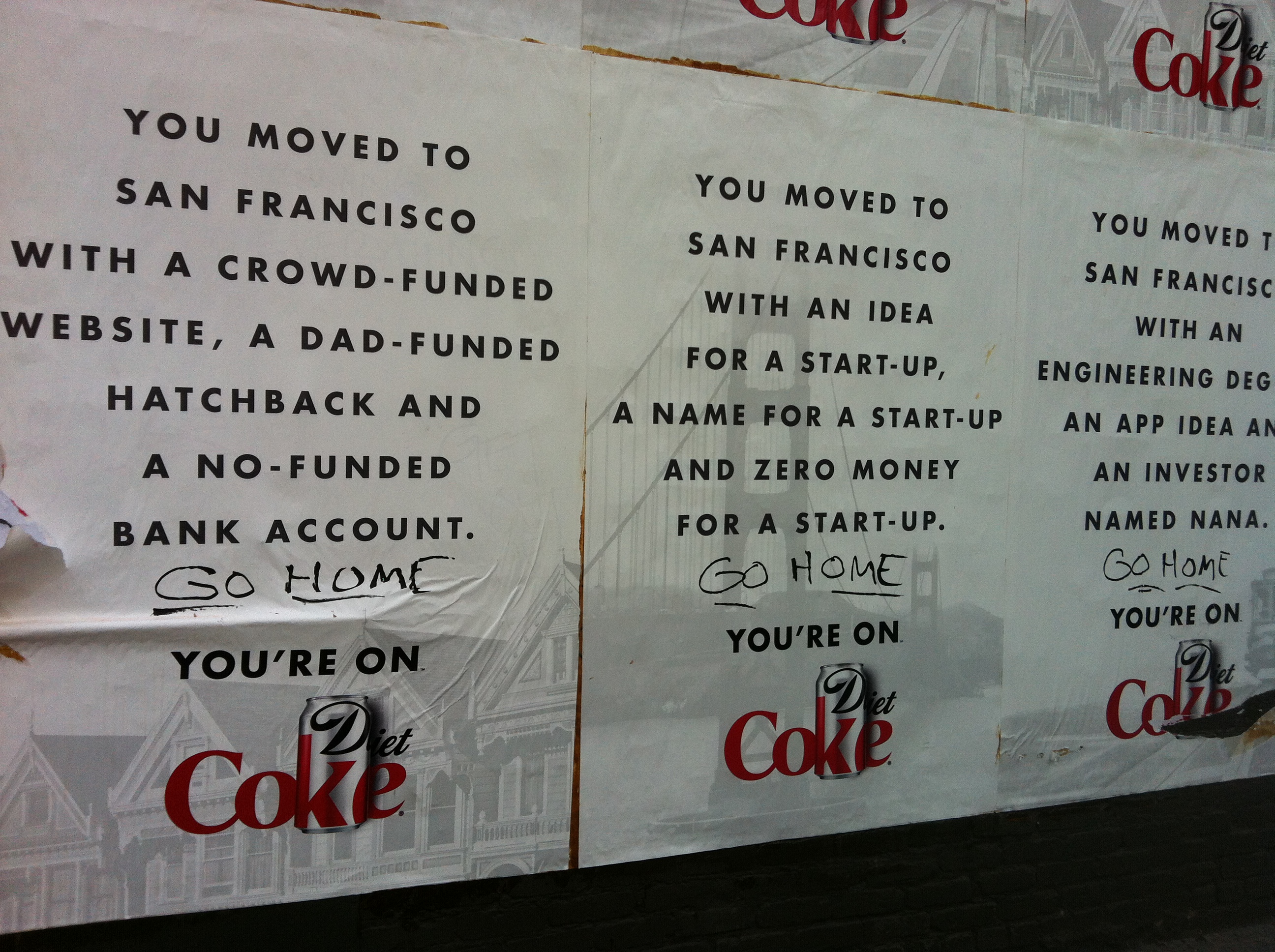 Dass Coca-Colas Willkommensgruß an die Unternehmer der Tech-Industrie nicht von allen positiv aufgenommen wird, ist kein Geheimnis (siehe Techies go home!), und schnell werden die Werbeflächen zum Schauplatz der gegensätzlichen Positionen. Go Home, haut ab!, hat jemand mit Filzstift auf die Plakate geschrieben.