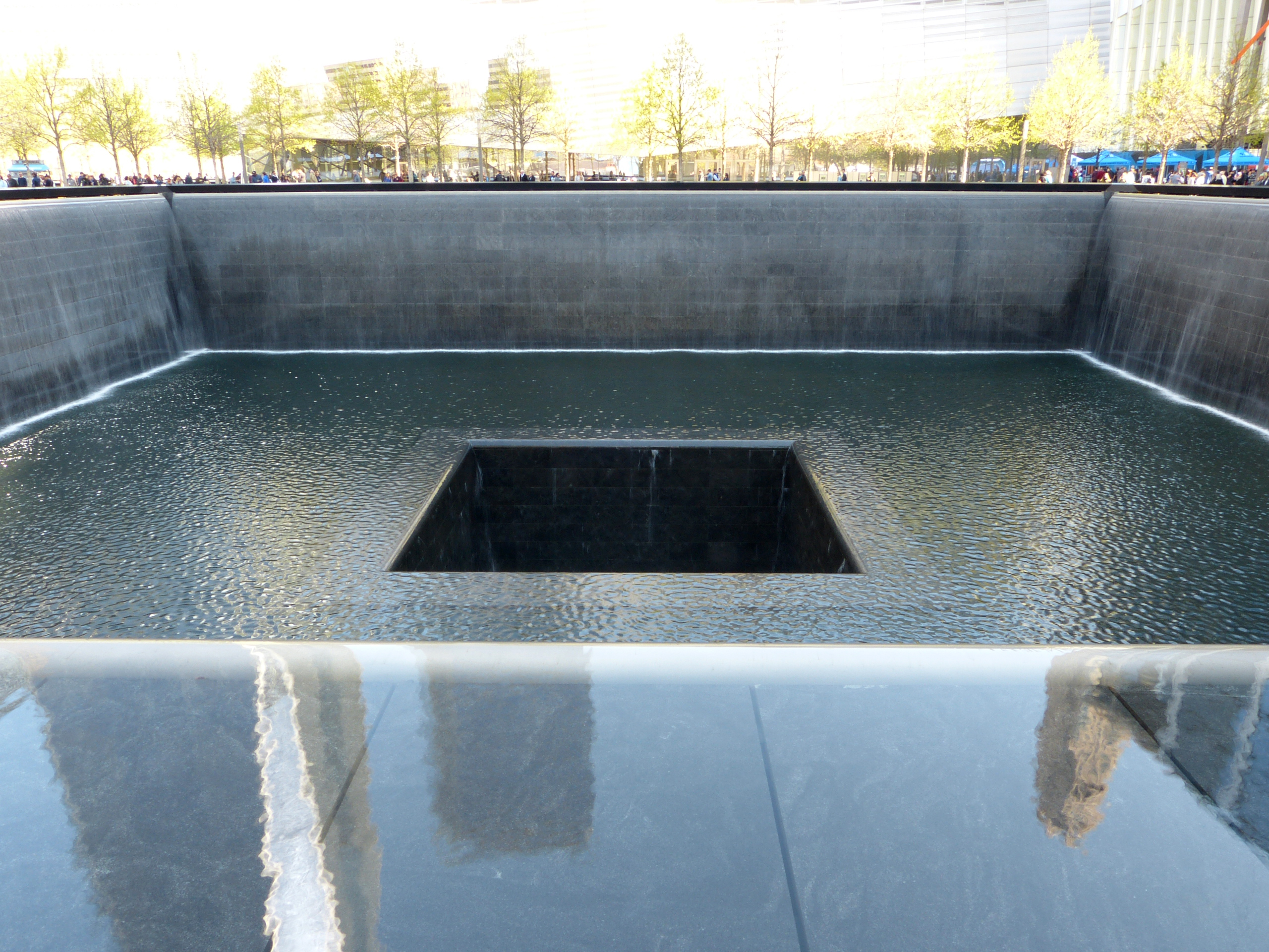 Kernstück des neuen Areals ist das 9/11 Memorial von Michael Arad, ein berührendes Mahnmal auf den Grundrissen der eingestürzten Türme. Wo sie einst standen befinden sich nun zwei gigantische Bassins aus dunklem Granit. Ununterbrochen fließt Wasser in den Abgrund in ihrer Mitte und symbolisiert den Verlust von Leben sowie die räumliche Leere, die der Terroranschlag hinterlassen hat. Auf den Rändern der Becken sind die Namen der Gestorbenen eingraviert.